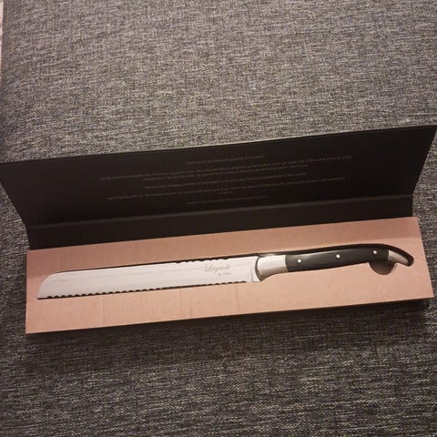 Helt ny/ubrugt brødkniv fra Laguiole by Hâws. 20 cm (bladet) med sort træhåndtag.