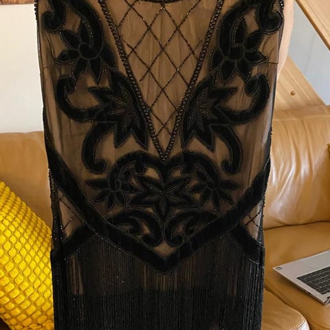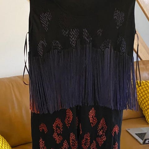 Cool kjole med dyb v-skæring. Sølvslange med Logo. Italiensk str. 46, passer M-L. Materialetag er klippet ud, superstrechy.