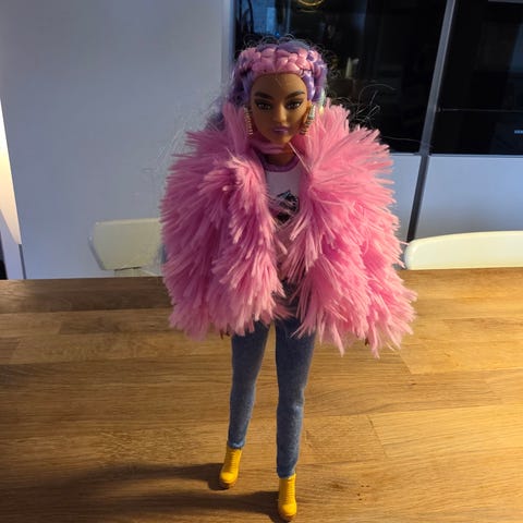 Barbie dukke med afrofrisure og pink scooter. Dukken er iført en lyserød jakke og har en grøn kurv på scooteren. Scooterens farve er pink, og den har detaljer som sæde og styr.