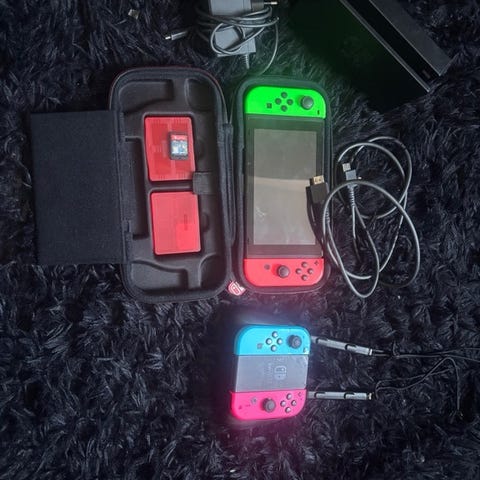 Kommer ikke med joycons, men der medfølger en original Pro controller (næsten som ny), samt en lækker grip controller til når man skal spille håndholdt (medfølger forskellige joystick der kan udskiftes)
