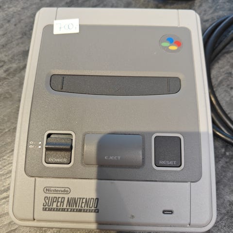 Original super Nintendo konsol med tilhørende kontroller og super Mario world spil.