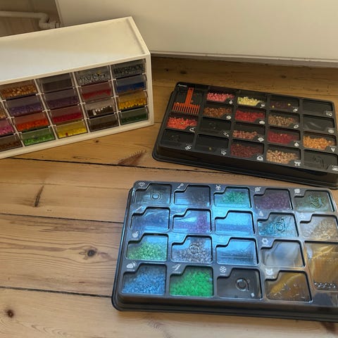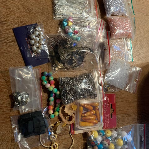 Flyttekasse med store poser med rørperler. 6000 perler pr. pose. Alle i stærke farver. Varerne stammer fra lukket webshop. Alle varer er ubrugte og af rigtig god kvalitet.