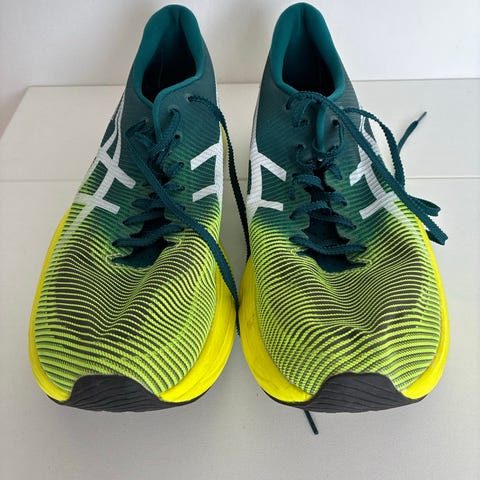 Asics løbesko i størrelse 45 med blå og orange farver. Skoene er designet til løb og har en gummisål med slidstærkt mønster for bedre greb. Overdelen er lavet af åndbart materiale for komfort under træning.