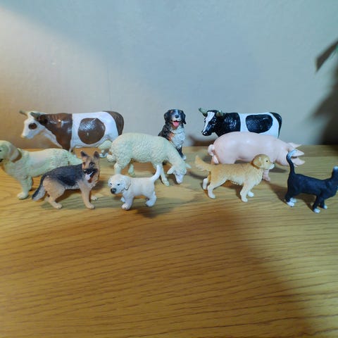 10 Figurer.. Alle er Schleich og i standen som ses på billedet. Figurerne sælges kun sammen i den pakke der er vist, Ingen løssalg. Sender med fast pris uanset vægt og antal af lots med DAO til 47kr.. Inkluderer: Tyr, Ged, Kat, Høne, Hvalp, Hund, Undulat, kanin, Gås