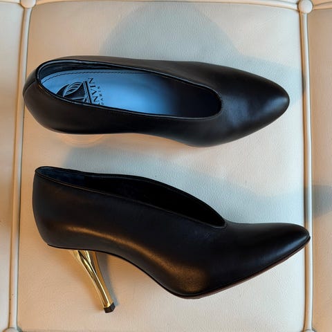 Elegante Lanvin stiletter fra Été 2010-kollektionen i sort læder med afrundet snude og åben hæl med elastisk afslutning. Indvendigt samt hæl udført i brunt læder.