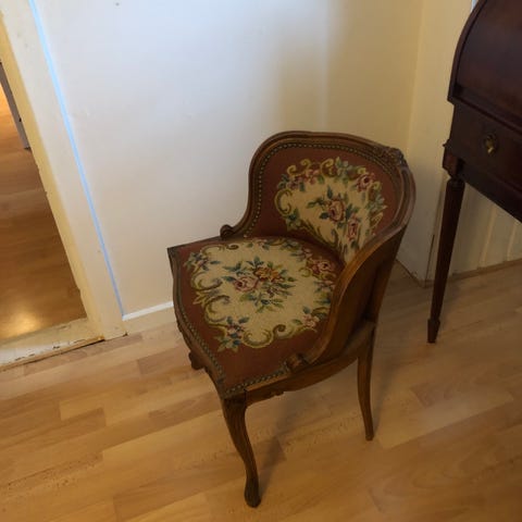 Antikt Chatol, antik stol med udskæringer og polstret sæde, avisholder m.flet.