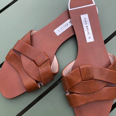 De, efterhånden, ikoniske slip-in sandaler i cognac farvet læder.
