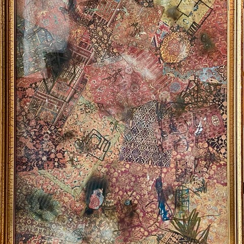 Fragmenteret landskab af papirsider fra et atlas. Signeret JK. Monteret i sortmalet træramme bag tyndakrylplade.