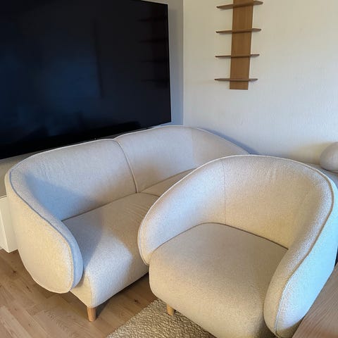 Flot og komfortabel sofa og lænestol i bouclé. Fremstår som nyt.