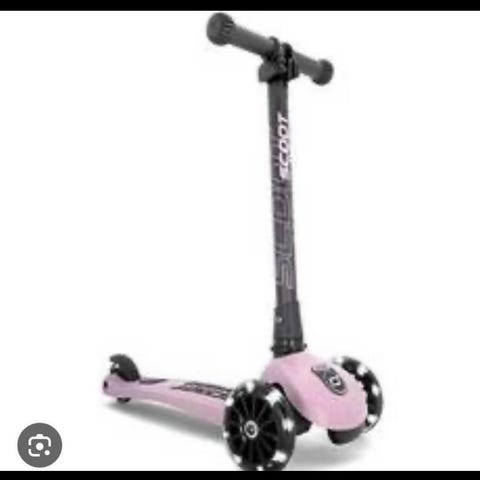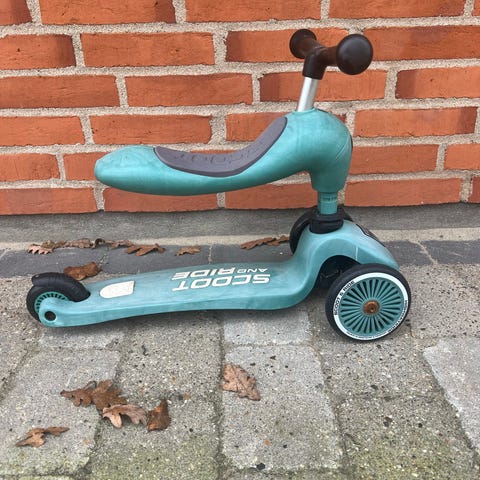 Scoot and Ride løbehjul med sæde i lyserød farve. Designet til børn med tre hjul for stabilitet og et integreret sæde, der kan bruges til at sidde på eller fjernes for at køre som et almindeligt løbehjul.