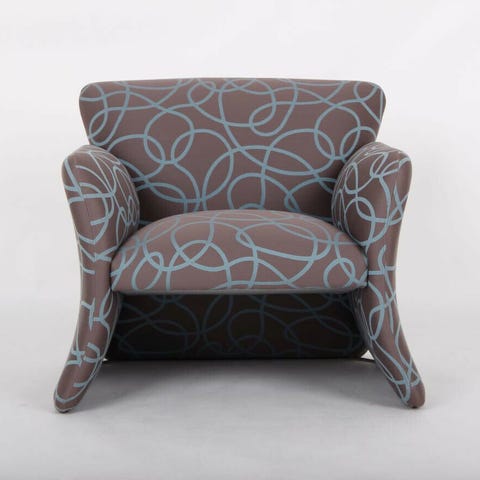 Susanne Grønlund, Mundo, Fredericia, stof blågrøn Hallingdal, drejelig stålsokkel, blank rød skal på undersiden, unik