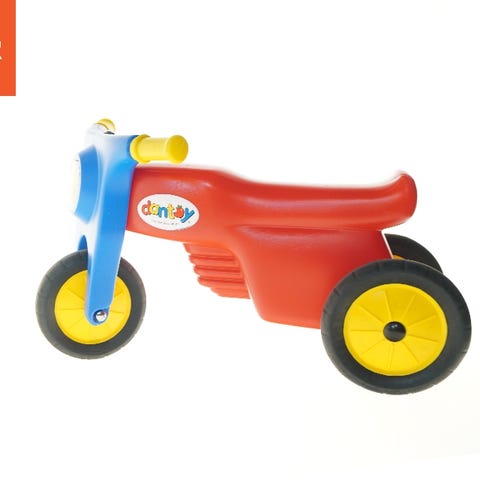 Dantoy Løbecykel i rød og blå plast. Designet til børn med tre hjul for stabilitet og gulne håndtag. Egnet til tidlig motorisk træning og balanceudvikling.