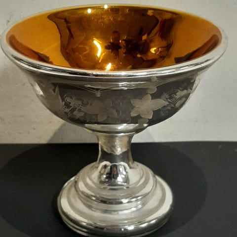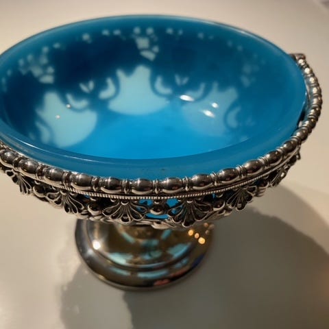 Flot og dekorativ sølv opsats med turkis blå glasindsats sælges.