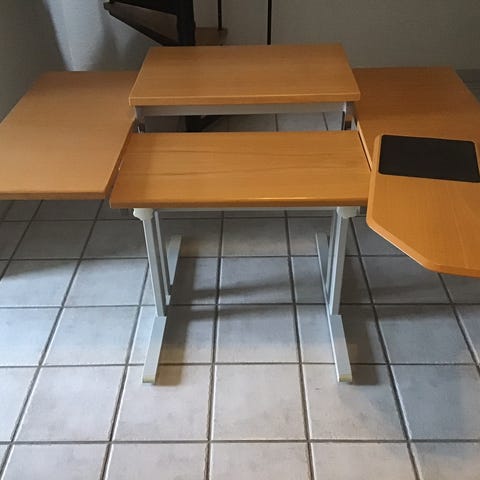 Stabil metalkonstruktion, pæn lysebrun bordplade uden synlige skader. Fungerer fejlfrit.