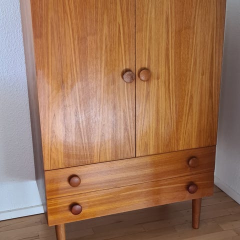 Super fint og praktisk skab / kommode fra 1960’erne. Dansk møbeldesign / midcentury klassisk dansk i teak. 2 låger og 2 skuffer for neden. Skuffer og låge kan låses og nøgle medfølger. Højt og slankt og derfor nemt anvendeligt til både køkken, stue eller børneværelse. H 120 B 83 D 40. Flot stand, flotte overflader med almindelige brugsspor. Kan leveres