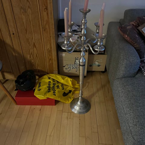 5-armet kandelaber fremstillet i gedigent metal. Designet til at holde fem stearinlys og egnet til dekoration eller belysning i hjemmet.