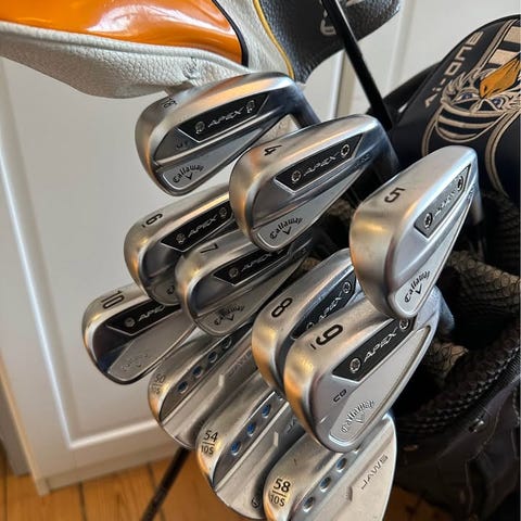 Sælger dette komplette sæt Callaway Ai Smoke jern (4-PW), som er årets model (2024). Det er markedets måske mest tilgivende jern, der giver masser af gratis længde og hjælp, selvom man ikke rammer den i midten hver gang.
