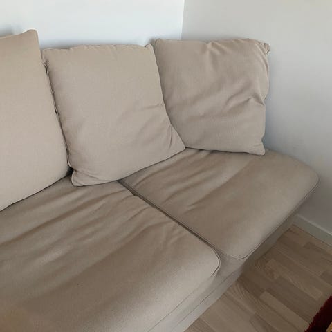Sofaen fremstår med tydelige brugsspor og kunne også trænge til en vask. Betræk på hynderne kan tages af og vaskes.