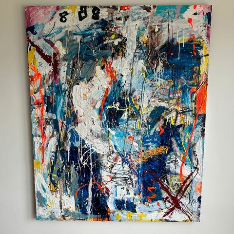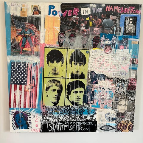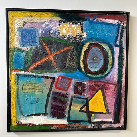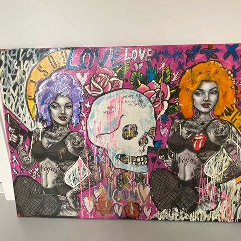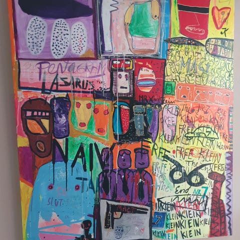Jan Klein maleri. Endnu et unikt maleri fra den kreative/dygtige kunstner Jan Klein. Abstrakt maleri (dog en del tekst) i en skøn farvepalet af dekorative farver. Lidt atypisk Klein maleri. Måler 90x120 cm.