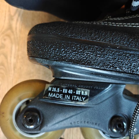 De sælges med alle stumper, manual og orig emballage. Og så er der et sæt klinger med til is, så de kan konverteres til isskøjter på 5 minutter.