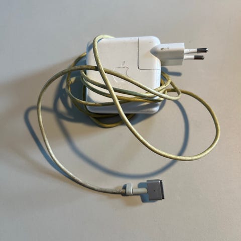 Apple MagSafe 2 adapter til opladning af kompatible MacBook-enheder. Hvid farve med integreret kabel og magnetisk stik for sikker tilslutning.