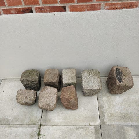 280 brosten/jalousisten i størrelsen 10-15 cm. Brostenene er velegnede til belægning og haveanlæg. Farven varierer mellem grå og brun nuancer.