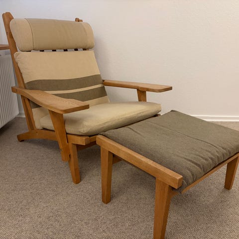 Stolen er ombetrukket i august 2023 med mørk koksgråt uld og nye koldskumshynder.