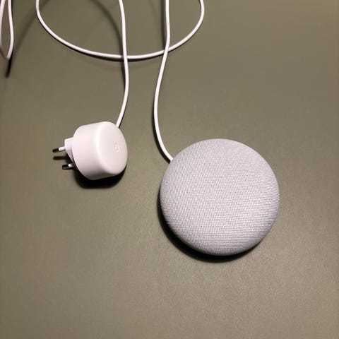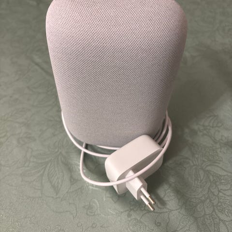 Google Nest Mini smart højttaler i sort farve. En kompakt enhed designet til stemmestyret betjening og afspilning af lyd. Gen 2