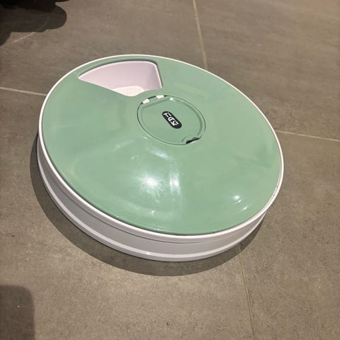 Tiaki Automatic Feeder hundemadskål med automatisk fodringsfunktion. Designet til at give hunde regelmæssige måltider uden manuel tilsyn. Skålen har en rund form og er fremstillet i holdbart materiale.