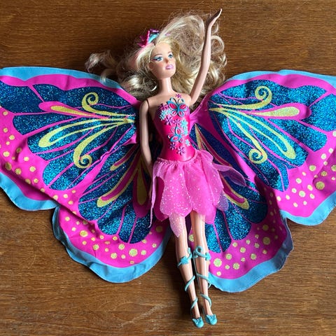 Barbie Dance and Flutter-dukken en magisk 2-i-1-forvandling! Tryk blot på halskæden på dukkens overdel, og se hendes lilla overskørt folde sig ud. For at lukke vingerne skal du blot skubbe dem på plads - tryk derefter på knappen for at genaktivere og udspille det magiske øjeblik igen og igen!