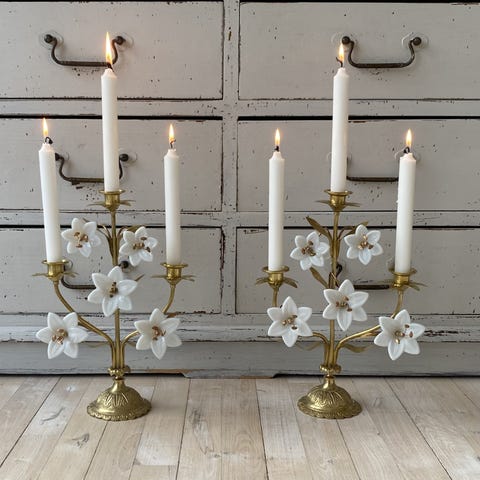 Antik fransk kirkestage. Fantastisk smuk antik fransk kirkestage. Stagen er udført i forgyldt bronze og er blevet pudset, så den fremstår med en smuk gylden glans. Kirkestagen er dekoreret med fem hvide liljer (symbol på uskyld) i opalglas. Den imponerende blomsterkrone med plads til 3 lys bæres af en smuk fod udsmykket med dekorative ornamenter. Kirkestagen er formentlig foræret til kirken af en velstående borger som tak for en lykkelig begivenhed. Fra ca. 1890