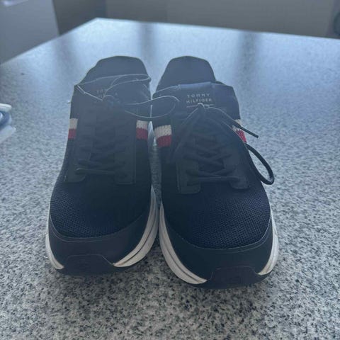 Tommy Hilfiger Sneakers i størrelse 43. Skoene er sorte med hvide såler og har snørelukning. Materialet fremstår som syntetisk eller læderlignende. Designet er enkelt og velegnet til hverdagsbrug.