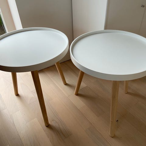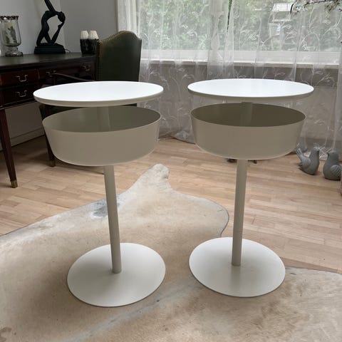 Sidebord med sort/hvid (kan vendes) bordplade og hvide ben. Materiale: laminat bordplade med metalben. Velegnet som sidebord i stue eller soveværelse. 2 stk til salg. 1 stk = 100 kr. 2 stk =150 kr.