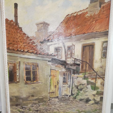 Stråtag landhus på grus landevej ved hvede mark. Kunstner P. Brun