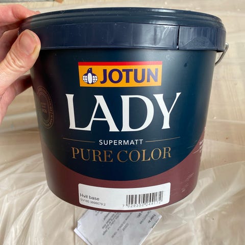 Jotun Lady vægmaling med en mat finish i farven Silke. Se farven på væggen bag spanden:)