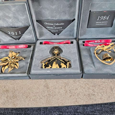 2 stk. spritnye og forgyldte juleuroer fra Royal Copenhagens serie Golden Christmas med motiv af hhv. misteltenkrans og blomsterkrans med fugl.