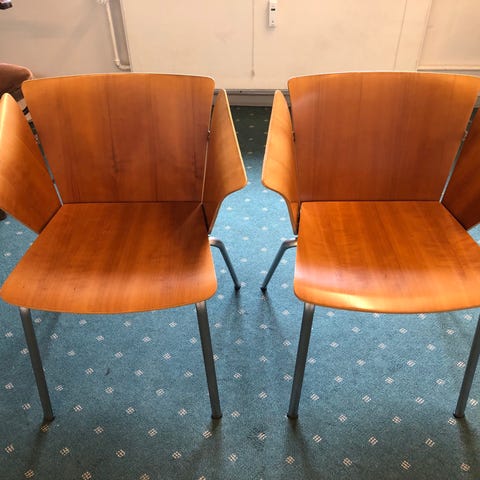 Designet af Vico Magistretti til Fritz Hansen i 1999. Disse elegante og stabelbare stole har formstøbte krydsfinersæder med en varm træfinish og slanke rørstålrammer med karakteristiske buede armlæn. Dertil har alle stole skindbetræk i farven bordeaux.