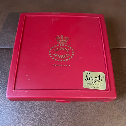 Georg Jensen Juleuro fra 1996 i med rød ophængssnor. Juleuroen har detaljeret design med tre figurer og stjerne. Leveres i original rød æske med Georg Jensen logo.