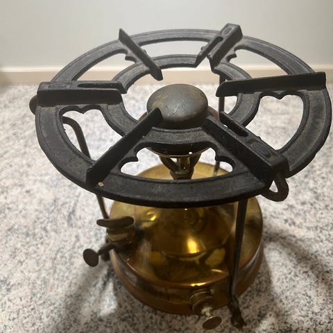 Messing brænder til camping med metalstel og ventil. Velegnet til udendørs madlavning og opvarmning. Robust konstruktion i messing med støtteben til stabilitet.
