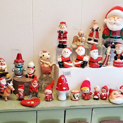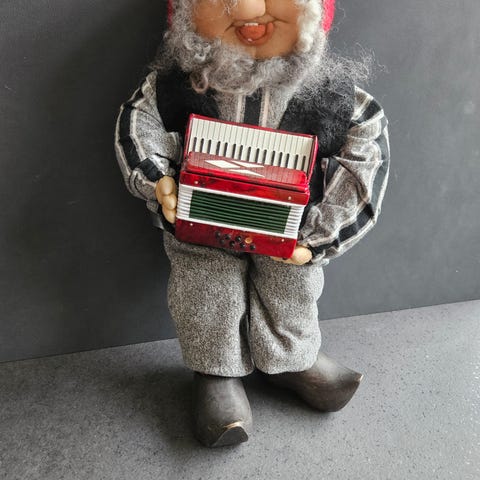 Sød og blød gammel Nissedukke fra 1950erne med rød dragt med pels kanter og grønt halstørklæde.