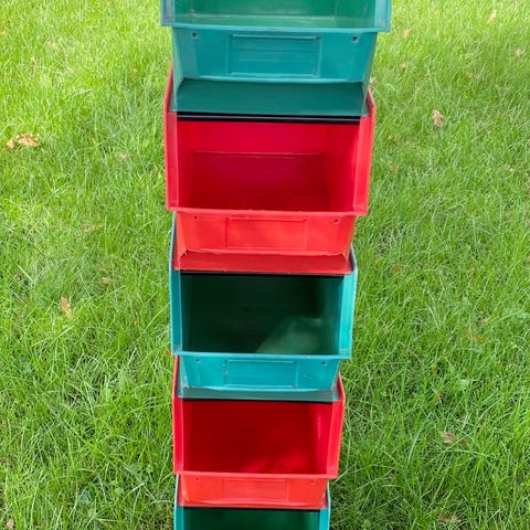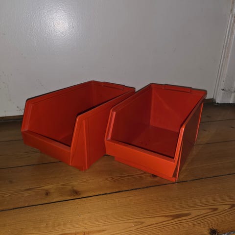 Har en del plukkasser. De har tidligere været anvendt til opbevaring af sko.