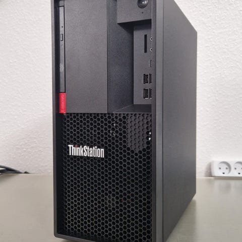 Lenovo ThinkStation stationær computer med sort kabinet. Udstyret med CD/DVD-drev og flere tilslutningsporte inklusive USB, VGA, PS/2 og netværksport. Samsung LED skærm med arm til væg eller bord.