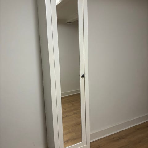 IKEA HEMNES højskab med spejllåge i hvid farve med flere hylder indvendigt. Skabet har en integreret spejldør og er velegnet til opbevaring i badeværelse eller andre rum. Materialet er træbaseret, og designet er enkelt og funktionelt.