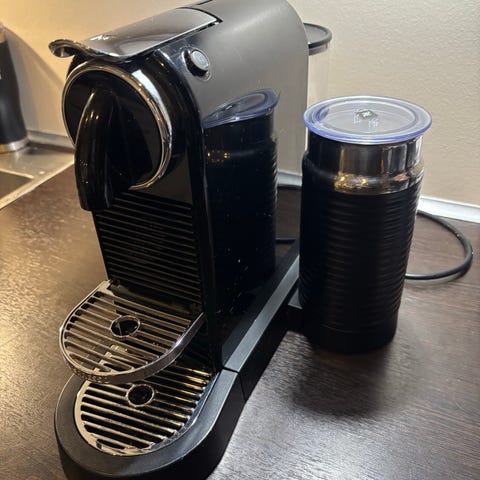 Nespresso CitiZ espressomaskine med integreret mælkeskummer. Maskinen er sort og har et kompakt design, der passer til mindre køkkener. Velegnet til fremstilling af espresso og mælkebaserede kaffedrikke.