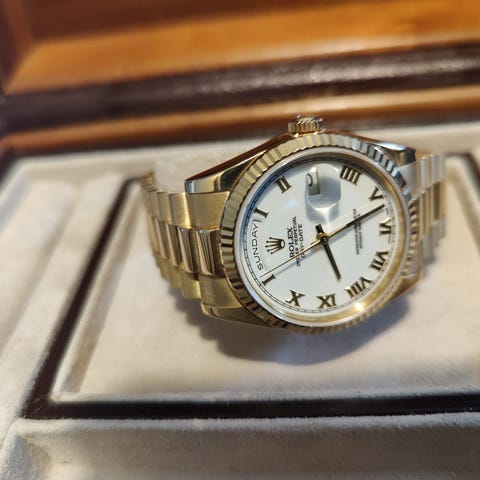 Et smukt Day-Date II i hvidguld med sølv skive og president lænke. Det automatiske værk yder 48 timers gangreserve. Vandtæthed til 100m.