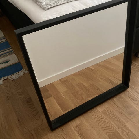 Sælger dette sortbrune spejl fra ikea med bred ramme.