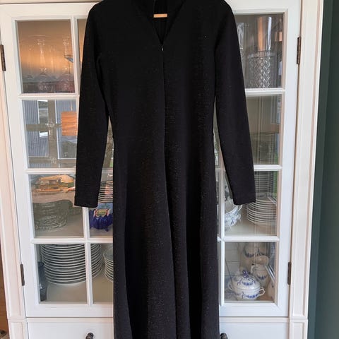 Flot glimmerkjole perfekt til Nytårsfesten. Den er helt ny og ubrugt. Elastisk i stoffet og kan derfor passe både en s/m/l. Måler ca 70 cm i livet (elastik) ca 120 cm i den ene side fra ærmegab og ned og ca 80 cm i den anden. Fint lille bindebånd i halsen som giver kjolen et eksklusivt udseende. Nypris kr 1000