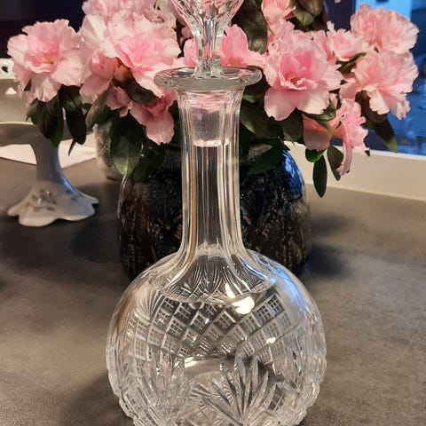 FIN LILLE KRYSTAL KARAFFEL,MED SMUKT MØNSTER,SAMT SORT LILLE URTEPOTTE