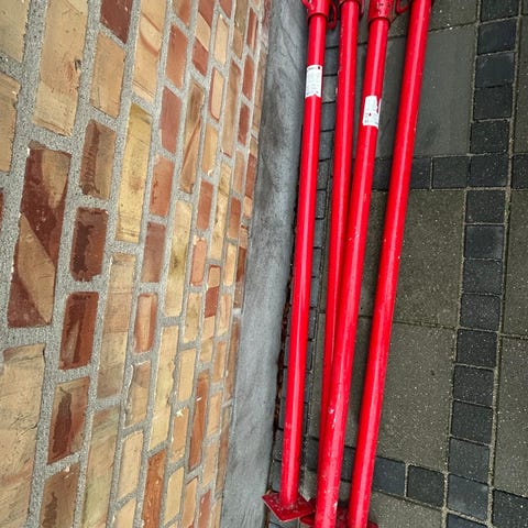Justerbare murerstøtter i blå farve. Støttestængerne er designet til at give støtte og stabilitet ved byggeprojekter.