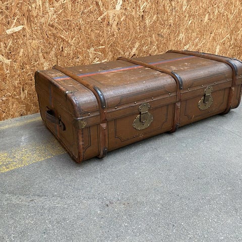 Jeg sælger denne store rejsekuffert kommode i læder og med træ-effekter – et statement piece til dig med smag for kvalitet og karakter. Udført i kraftigt nøddebrunt læder med massiv tilstedeværelse og klassisk britisk attitude. Indvendigt gemmer den på flere rummelige skuffer, foret med olivengrønt stof – en elegant kontrast til det rå ydre.